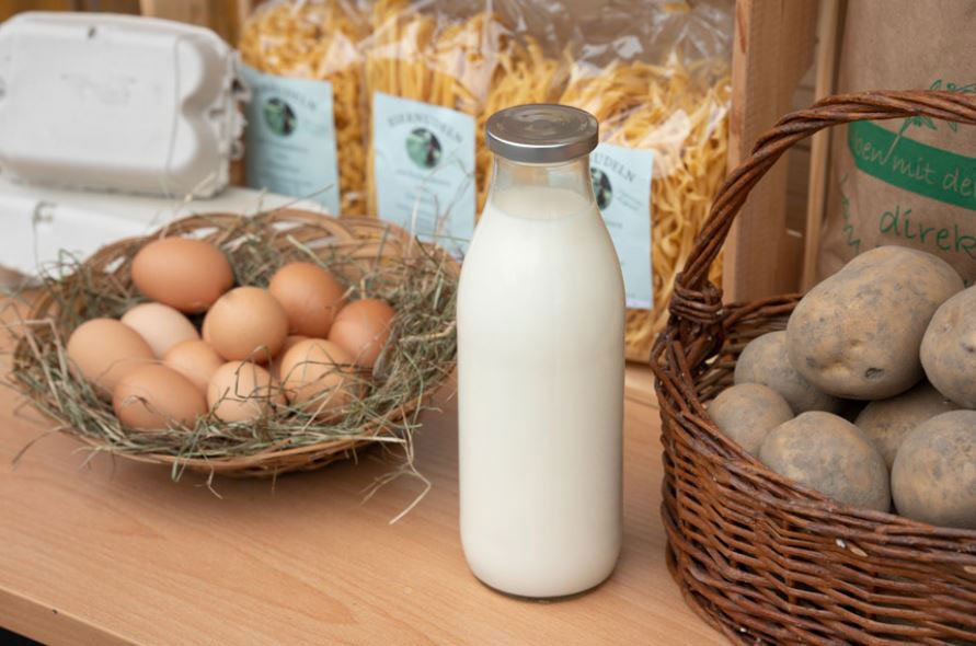 Neben unseren Milchkühen und einem ganztägig zugänglichen Milchautomaten bieten wir noch Kartoffeln aus eigenem Anbau und täglich frische Eier von unseren Freilandhühnern.