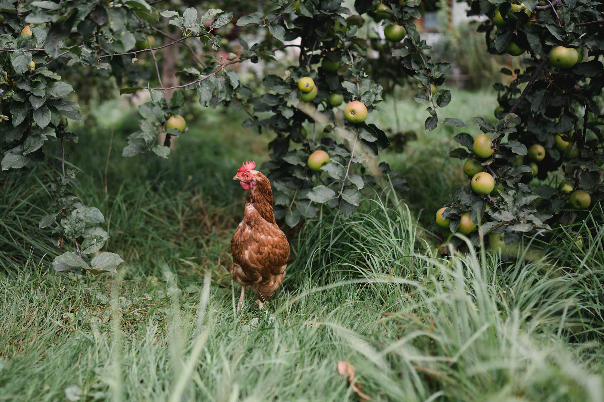2021 sind erstmals Freilandhühner bei uns am Heiselerhof in sogenannte mobile Hühnerställe eingezogen. Der Standort der Ställe, die an große Wohnmobile erinnern, wird in regelmäßigen Abständen verändert, womit den Hühnern, die täglich bis Sonnenuntergang ins Freie dürfen, stets frisches Grün geboten werden kann. Ab und an büxen ein oder zwei Hühner aus dem abgezäunten Bereich aus und spazieren dann über den Hof – die Chance, ein Huhn streicheln zu können ist bei uns am Heiselerhof also recht groß!